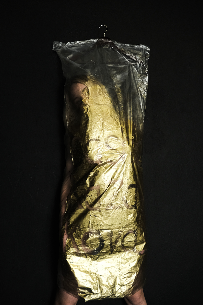 Мои очумелые ручки не смогли осуществить референс на 100%, но это и к лучшему, как всегда. Оказалось, писать маркером на целлофане непросто, а поливать его из баллончика «жидким золотом» еще сложнее. Буквы не так ярко читаются, зато какая модель! Вайб сочный, я фотками довольна, Настя тоже 😂
