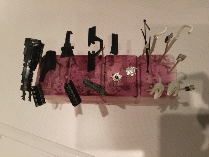Первые склеенные узлы и некоторые детали я покрыл мелкозернистой финишной грунтовкой (Mr.HOBBY) прямо в литниках: для кузова и салона использовал серую, а для элементов шасси и прочей мелочёвки - чёрную.