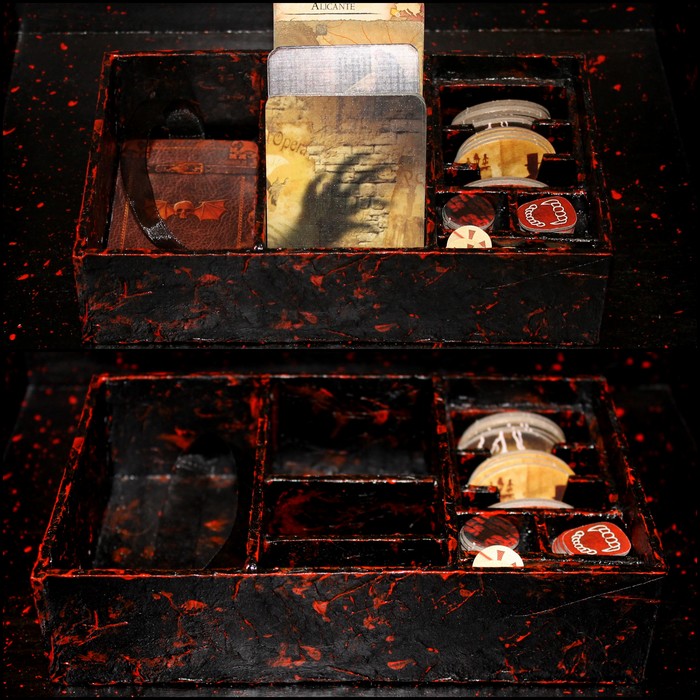 У Дракулы есть три колоды: города, по которым он перемещается, ловушки и карты боя. Ловушки делятся не те, что в руке, и оставшуюся колоду (плюс еще сброс, но про него я забыла, когда делала органайзер: я за Дракулу играла всего разок) Т.к. игра занимает много места, я решила, что будет круто хранить карты вертикально: бои у нас случаются довольно редко, так что карты боя лежат слева, а две стопки ловушек и города стоят друг за другом. Идея, вроде, хороша, но как-то не зашла. Скорее всего потому, что я просчиталась и сделала ячейки слишком узкими, карты туда влезают, если их достаточно ровно сложить. Ну, а может, Дракула просто слишком занят планированием коварств, и ему некогда заниматься домашним бытом.