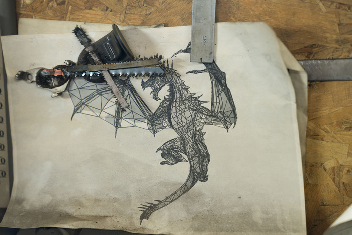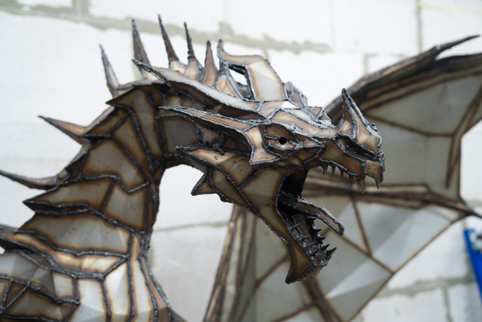 Год назад у него появилась идея сделать дракона. Стал мониторить интернет и увидел картину с огромным атакующим чудищем. Дальше смысла искать уже не было — он нашел своего нового героя. Как только дракончик стал рождаться из кусочков металла, жена Максима придумала ему имя — Гоша (Дракон - Дракоша - Гоша). И лишь спустя время, когда он выложил у себя в ВК фотографию этапа работы, ему написали, что это Алдуин. После чего наш мастер изучил историю этого персонажа и всей игровой вселенной.