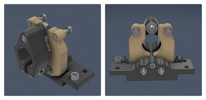 Основной корпус(база) изготовлен из алюминиевого профиля сечением 20*20мм и закрывается напечатанными панелями. На нем с низу закреплена струбцина для крепления к столу. С верху крепятся подшипники в корпусе через которые проходит алюминиевая трубка диаметром 20мм. Механизм возврата оси в центр и узел с магнитным датчиком для определения положения оси.