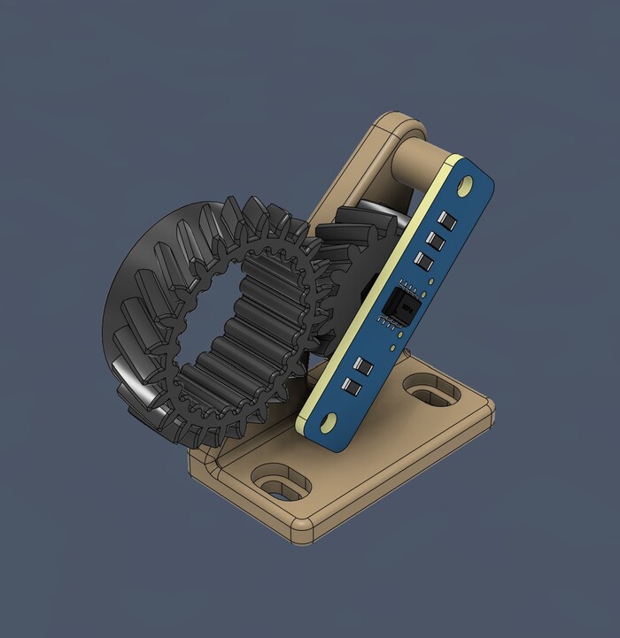 Положение осей считывается магнитным датчиком TLE5011. На трубе устанавливается ведущая шестерня, которая передает вращение на ведомую. В ведомой установлен магнит, при повороте которого считывается изменение магнитного поля датчиком.
