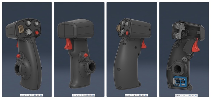 На ручке расположены различные кнопки, хатка, переключатель и гашетка. Внутри располагается печатная платка со сдвиговыми регистрами 74HC165 к которым эти кнопки и подключаются.