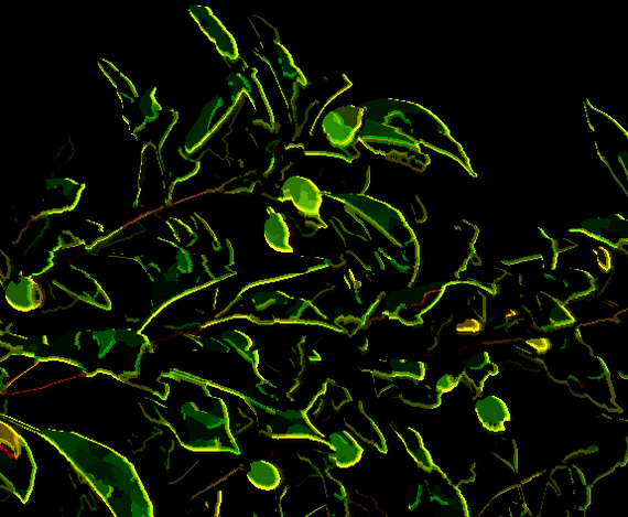 Исходник был неудачным снимком яблони в потёмках где-то на 35 мм ЭФР с максимальной яркостью выспышки, Canon A650 IS, 2 MPix. Плоский и мелкий, но с хорошим черным фоном.