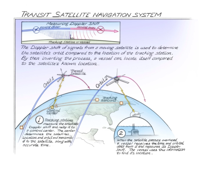 Первая навигационная система, описанная на этих принципах, появилась в 1959 году — её разработали DARPA и Институт Джонса Хопкинса. Она называлась Transit, или NAVSAT, и была создана для военно-морского флота США (в первую очередь для подводных лодок), но в 1967 году стала доступна и для гражданских судов. Transit позволяла определить местоположение судна с точностью до 30 метров, если оно стояло на месте.