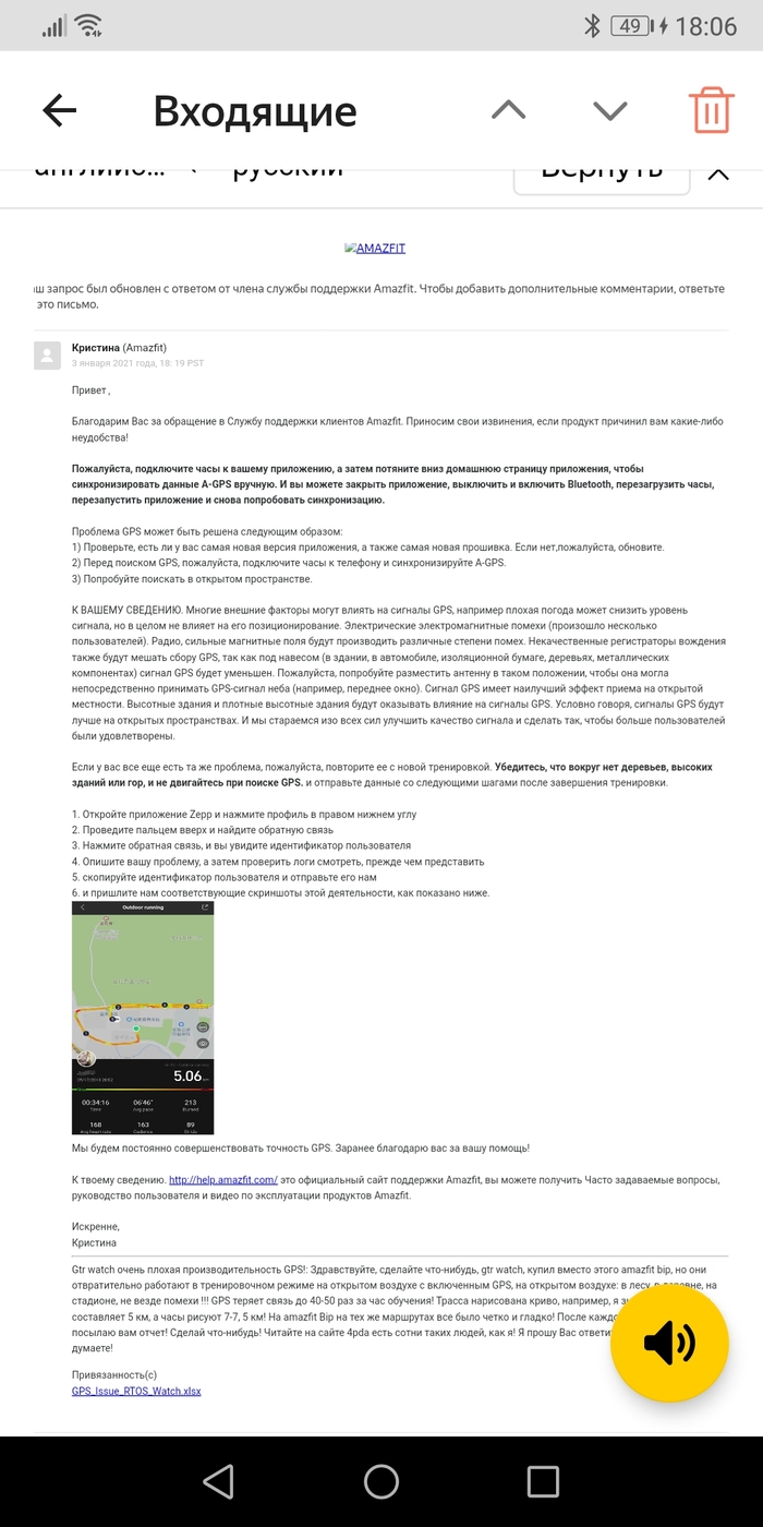 После каждой тренировки я через форму обратной связи в приложении zepp оставляю сообщение,(уже наверно раз 50 не меньше) но в ответ тишина. Пробывал также писать через почту производителя о проблеме, ответ пришёл некая Кристина написала что надо перезагрузить часы, обновить a-gps, отключить и включить блютус и написать им обратно о результате, хотя я так и делал, но я сделал ещё раз и написал им уже три раза и Кристина перестала отвечать.