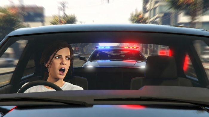Напряженный момент погони: красно-синие огни мигалок, визг шин, адреналин в стиле GTA 5.