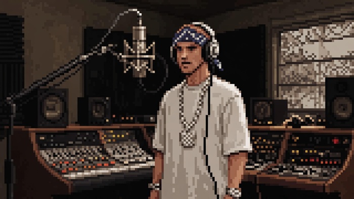 Ваш персонаж записывает трек в импровизированной студии — «битная» пиксельная графика и дух хип-хоп-культуры GTA San Andreas.