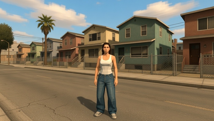 Используй внешность человека с загруженного фото. Сохрани основные черты лица узнаваемыми, но адаптируй их под низкополигональную графику PlayStation 2. Персонаж стоит на улице Grove Street из GTA San Andreas. Стиль — намеренно «битная», устаревшая 3D-графика: угловатые модели, размытые текстуры, низкое разрешение, характерная цветовая гамма ранних 2000-х. Одежда: белая майка, мешковатые джинсы, кеды. Атмосфера жаркого полудня в гетто Лос-Сантоса. Антипромпт: фотореализм, высокое разрешение, гладкие текстуры, современная графика, аниме, 2D.