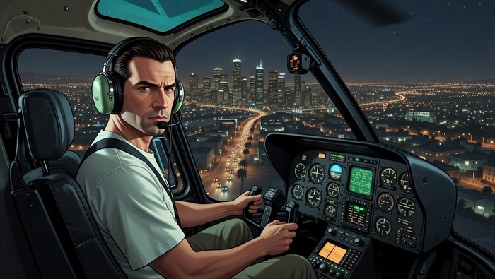 Используй внешность человека с загруженного фото. Сохрани все черты лица узнаваемыми. Персонаж в кресле пилота вертолета, руки на штурвале, в наушниках с микрофоном. Через лобовое стекло — панорама ночного мегаполиса в стиле Лос-Сантоса из GTA 5, тысячи огней, река автомобильных фар. Лицо подсвечено приборами кабины — зеленоватое свечение. Стиль — кинематографичный арт GTA 5, глубокая перспектива, детализированная панорама. Антипромпт: размытое лицо, дневное время, закрытые глаза, искаженные руки, мультяшный стиль, текст.
