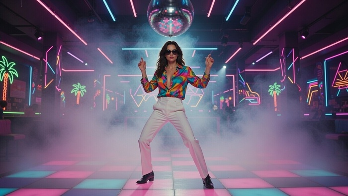 Вы — звезда танцпола в неоновом клубе 80-х, прямиком из мира GTA Vice City.