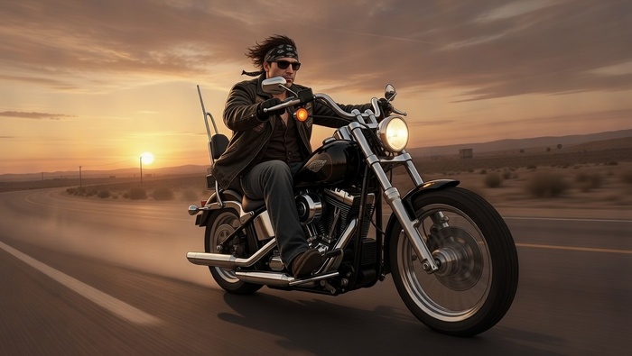 Используй внешность человека с загруженного фото. Сохрани все черты лица узнаваемыми. Персонаж на тяжелом мотоцикле-чоппере мчится по пустынному шоссе на закате. Кожаная куртка с нашивками, бандана, солнцезащитные очки. Стиль — арт GTA: The Lost and Damned, мрачноватая, теплая палитра с оранжево-коричневыми тонами. Камера — динамичный ракурс сбоку и чуть снизу, волосы развеваются на ветру. Антипромпт: нечеткое лицо, искаженные пропорции, велосипед, яркие неоновые цвета, дождь, текст.