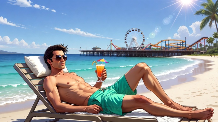 Используй внешность человека с загруженного фото. Сохрани все черты лица узнаваемыми. Персонаж полулежит на шезлонге на пляже Санта-Мария из GTA 5. Яркое солнце, бирюзовый океан, белый песок, на заднем плане — пирс с аттракционами. Одежда: яркие пляжные шорты, солнцезащитные очки, в руке — коктейль с зонтиком. Стиль — яркий, солнечный арт GTA 5, насыщенные летние цвета, легкая стилизация под цифровую живопись. Антипромпт: размытое лицо, бледная палитра, зимняя одежда, пасмурная погода, искаженная анатомия, лишние пальцы.