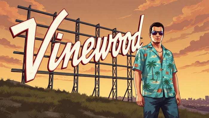 Вы стоите на фоне легендарной надписи «Vinewood» в лучах заката — каноничный кадр из GTA 5.