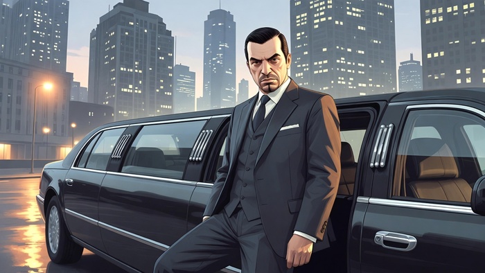 Используй внешность человека с загруженного фото. Сохрани все черты лица узнаваемыми и детализированными. Персонаж в дорогом темном костюме-тройке выходит из черного лимузина на фоне небоскребов, напоминающих даунтаун Либерти-Сити из GTA 4. Вечерний свет, мокрый асфальт, отражения фонарей. Поза — уверенная, деловая. Цветовая палитра — приглушенная, холодные серо-синие тона с теплыми акцентами фонарей. Стиль — реалистичный арт GTA 4, атмосферный и мрачноватый. Антипромпт: яркие неоновые цвета, тропическая зелень, нечеткое лицо, мультяшность, лишние пальцы, текст.