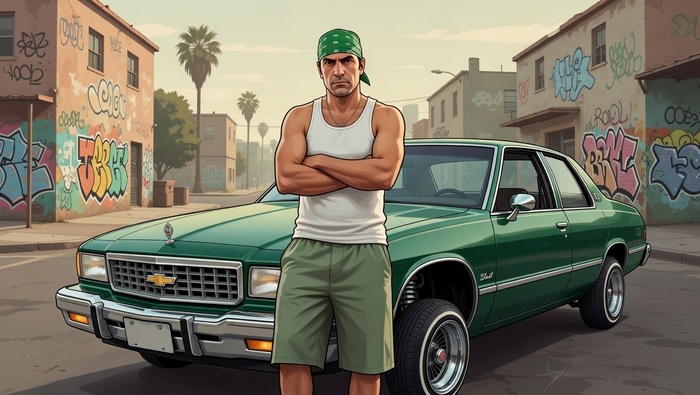 Используй внешность человека с загруженного фото. Сохрани все черты лица узнаваемыми. Персонаж стоит, прислонившись к капоту лоурайдера — зеленого Chevrolet Impala с гидравликой — на перекрестке бедного района. Стены домов исписаны граффити, на заднем плане — пальмы и выгоревшее небо. Стиль — арт GTA San Andreas, теплая палитра с приглушенными цветами, легкая стилизация. Одежда: зеленая бандана, белая майка, длинные шорты. Поза — расслабленная, руки скрещены. Антипромпт: нечеткое лицо, искаженные пропорции, снег, холодная палитра, современные автомобили, текст, аниме.