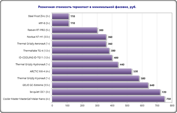 Заключительной диаграммой нашего сегодняшнего тестирования термопаст будет сравнение их стоимости на российском рынке при покупке в минимальном объёме.