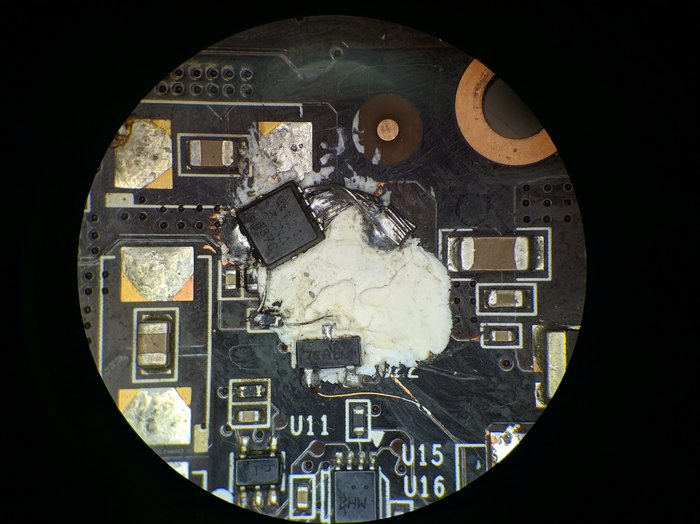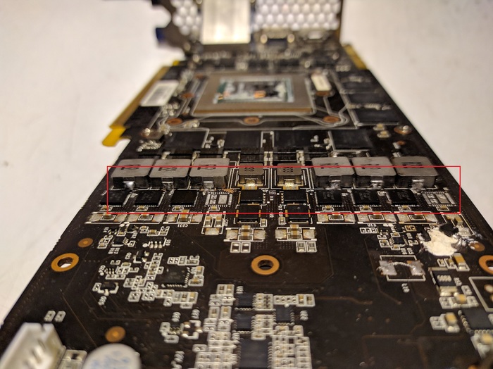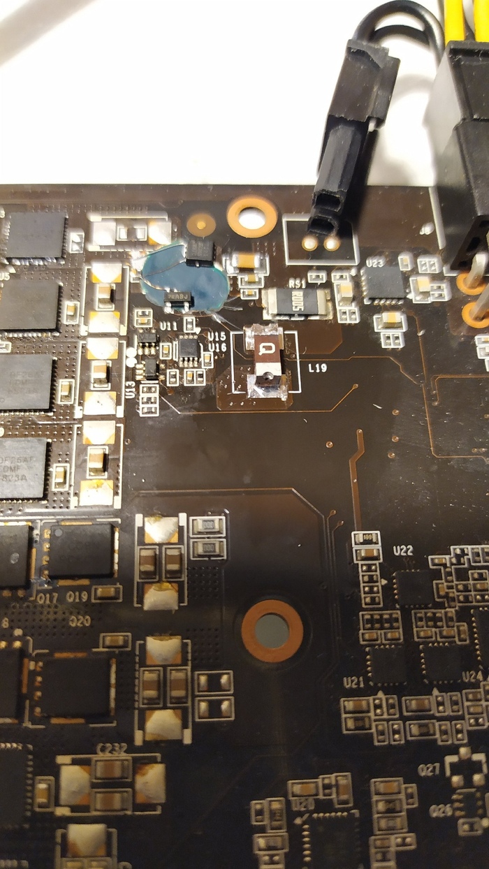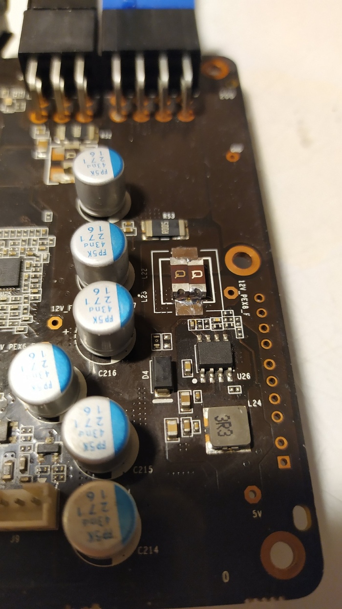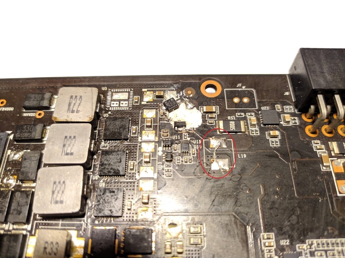 После разборки стало понятно, что паяли почти всё, что можно. Все катушки на питании чипа поднимались или снимались, скорее второе, потому что в дальнейшем при нормальной установке без соплей припоя вывод одной из катушек просто отвалился при пайке. А снимали по той причине, что очень трудно (НЕТ) в данной ситуации же определить какой DrMos пробитый. Удивительно, но ведь определили и сняли их, только на этом похоже и закончили всё. Ставить рабочие не стали.