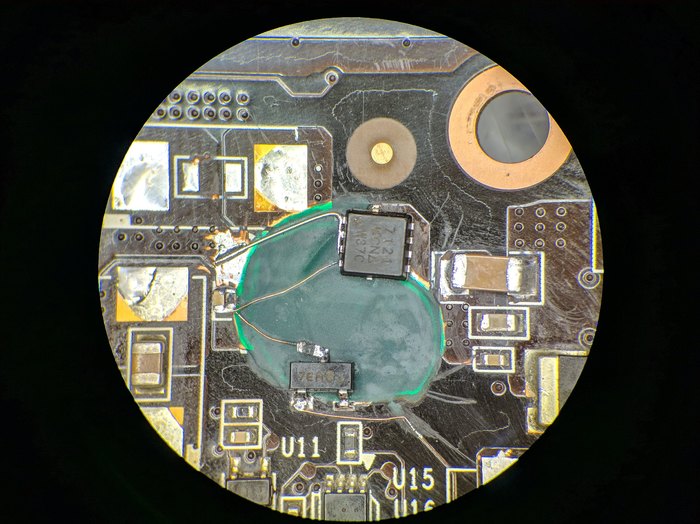 Переделаем это всё и поставим ключ пузом на оставшийся островок целой платы. Ну и по возможности вокруг поаккуратнее сделаем тоже, хотя после таких ковыряний редко это провернуть. Почему такие разводы? Потому что прошлый флюс так "смывается", в итоге вымыл конечно, не так заметны стали разводы просто.