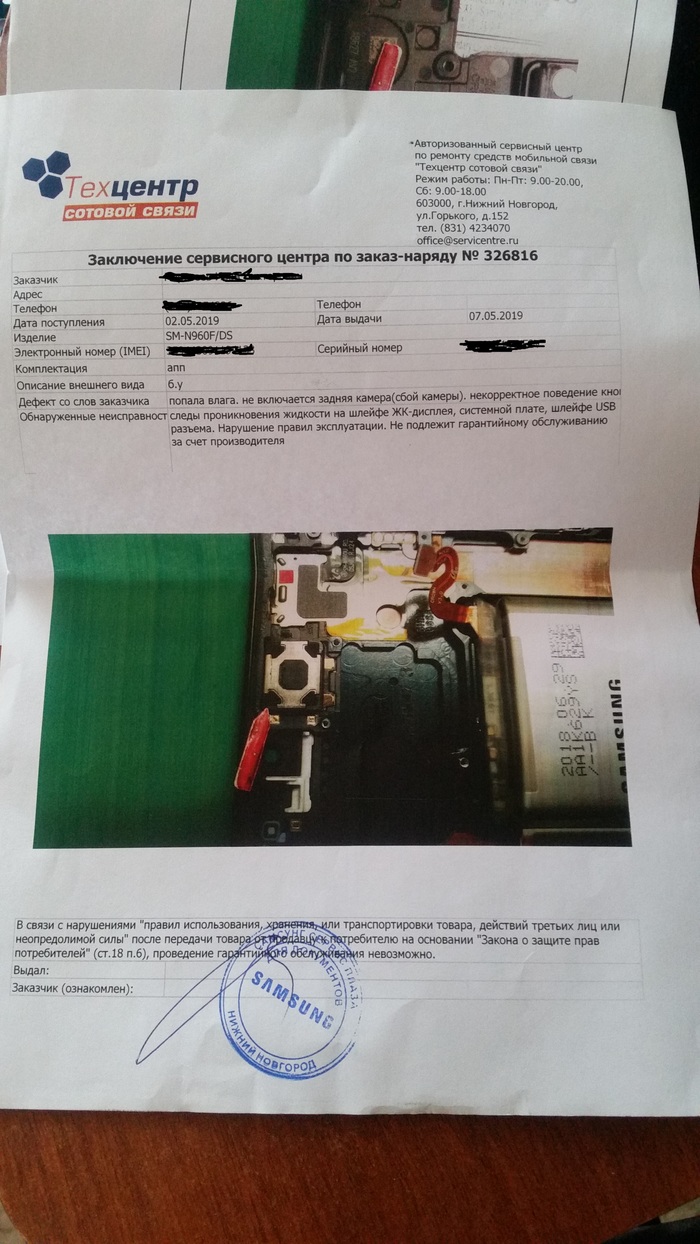 Мною был приобретен вершина смартфоностроения Samsung Galaxy note 9. Одной из приятных особенностей для меня было наличие пылевлагозащиты по суперским стандартам (погружение на полтора мета на пол часа в воду). Радовал аппарат меня ровно до тех пор, пока не побывал на отдыхе в аквапарке. После незначительных погружений в воду (пресную) и съемок в условиях повышенной влажности обратил внимание на запотевшие глазки камер изнутри. На следующий день отказала задняя камера и вибромотор. С данным вопросом обратился в фирменный гарантийный салон "Самсунг плаза" (Нижний Новгород, ул. Горького, д.152). Там мне сообщили, что будут выходить на связь с главной конторой для вынесения решения, поскольку возможен брак герметичности устройства. Ну все норм, подумал я... не даром же повсюду красуется влагозащита и модные стандарты на коробке и рекламных акциях компании, должны гарантировать заявленную возможность, подумал я. Однако, я глубоко ошибался. Через несколько дней со мной на связь вышла вежливая менеджер Мария, которая сообщила радостную новость, что инженер самсунг по фотографиям (прямо как экстрасенс), предоставленным из сервисного центра, увидел следы влаги внутри смартфона, а такого быть не может, их продукция защищена от воды по топовым технологиям, а значит вина на мне. Далее мне вменяли, что с моей стороны было воздействие воды под высоким давлением, затем мне вменяли, что я специально открыл лоток для sim карты перед погружением, хотя все это не является действительностью (навязывали мне это очень интенсивно с явным раздражением и презрением в голосе). По итогам в гарантии мне было отказано в связи с нарушениями порядка эксплуатации, а в том же сервисном центре вежливо предложили замену системной платы и шлейфа системного разъема стоимостью 32 000 рублей с последующей диагностикой и поиском новых неисправных компонент, требующих замены.