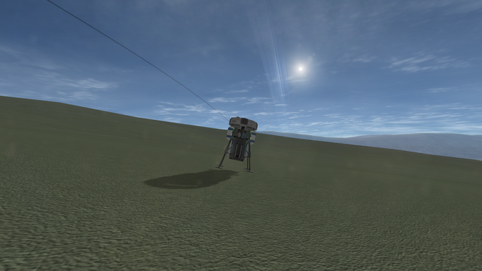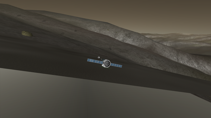 Раскрывшийся главный парашют плюс-минус стабилизировал зонд. Джемин висел низко над горизонтом, я надеялся, что он будет виден и с места посадки - хотел сделать кадр на штатную камеру зонда. Но мне не повезло, зонд садился в долинку, и Джемин закрыли складки местности.