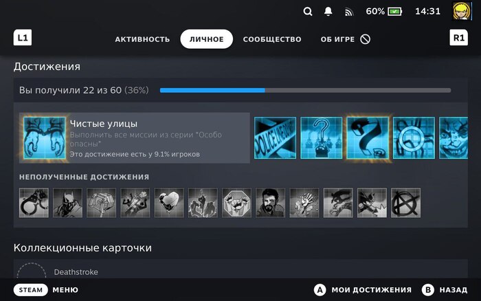 Получено 22 достижения из 60 (там 60 из-за DLC, которого у меня нет).