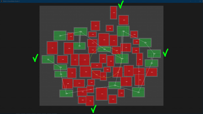 Не зря ведь в заголовке написано "как потеряться в массивах" - надо оправдывать название) Берем наш двумерный массив, пробегаемся по каждой комнате по её id и вызовем функцию GMS distance_to_object(). Запишем значение в соответствующую ячейку, и, вуаля, получим заполненный массив с расстояниями между всеми комнатами. Теперь дело за малым - находим в каждой строке матрицы минимальное значение, не включая элемент, в котором индекс строки совпадает с индексом столбца (очевидно, ведь это путь от себя до себя и он равен 0) и сохраняем отдельно. Теперь у нас есть список наименьших путей, по которому мы сможем соединить между собой все комнаты. Но, думаю, если здесь есть те, кто имеет опыт работы с GMS и уже успели задаться вопросом: зачем заниматься всем этим, заполнять матрицу и искать меньшие значения, если есть чудесная функция instance_nearest(), которая и находит минимальную дистанцию до ближайшего объекта? Отвечу: