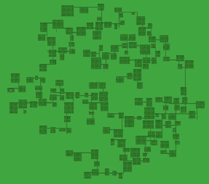 На картинке еще можно найти некоторые огрехи - маленькие тупики, но там проблема забавная - рядом с этими тупиками есть спрятанная комната, её не видно, но она не вошла в основные или дополнительные и просто сидит рядом. Поэтому, алгоритм удаления тупиков принял её за соседа и оставил туннель.