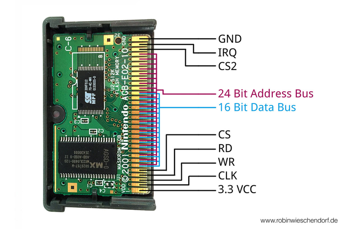 В отличии от NES с ее сложными картриджами, где было сразу два адресных пространства (для PPU и процессора), и мапперы, ориентировавшиеся на аппаратные особенности Фамикома, в GBA картриджи были очень простыми. По сути, это просто параллельная 16-битная шина 8080, которая включается напрямую в адресное пространство процессора и куда BIOS оригинальной консоли передает управление после инициализации.