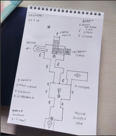 3. Набросок от руки (опционально). Я беру линейку, карандаш и матершину и начинаю прорисовывать в блокноте возможные варианты локации.