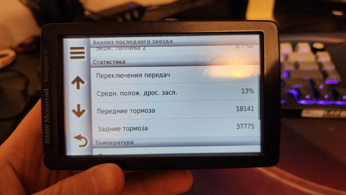 Устройство умеет читать статистику мотоцикла. Я выяснил, что предыдущий владелец не очень любил газ и очень любил задний тормоз. Колесиком на левой грипсе можно чуть-чуть управлять навигатором. Можно вывести данные от мотоцикла на крупный экран, например, сделать себе цифровой спидометр. Статистика - единственное преимущество устройства.