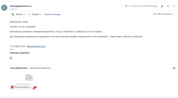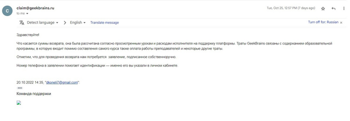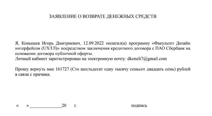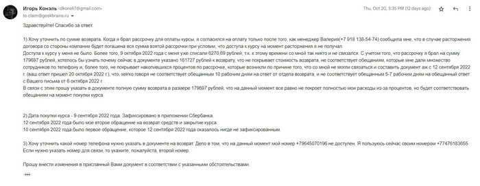 4. Истец отправил заявление ответчику на адрес электронной почты claim@geekbrains.ru, в котором уведомил ответчика о желании расторгнуть договор и возвратить уплаченные денежные средства в размере 200940 руб. Срок ожидания ответа со слов оператора 3 дня. Однако в указанный срок ответчик не связался с истцом, просьбы, указанные в заявлении, были проигнорированы.