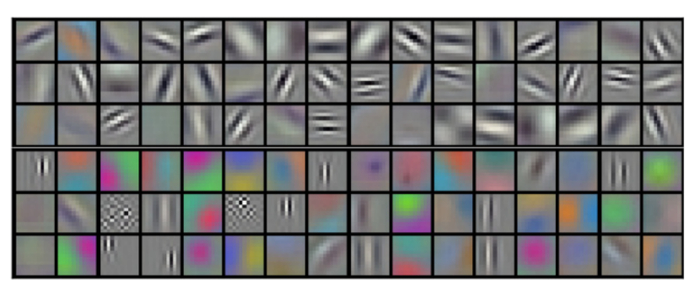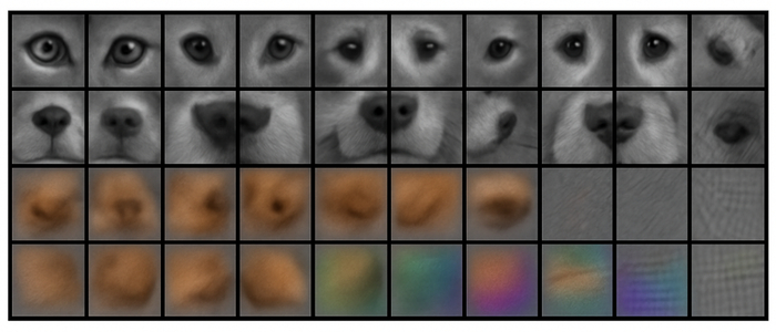 Получается на вход мы получили собачку, свернули ее, получили слой со смыслом собачки. Свернули смыслы собачек и получили подсмыслы — новый слой, а потом еще и еще много слоев. Если вы достанете веса с разных слоев обученной нейронки, то увидите, что на первых слоях всякие черточки, палочки, кружочки, кусочки текстуры.