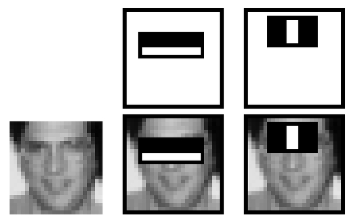 О чудо, машина кажется научилась видеть и понимать! Но это произошло задолго до нейросетей. Например, для определения человеческого лица — нужно найти вертикальный прямоугольник, горизонтальный прямоугольник, и два маленьких квадратика.