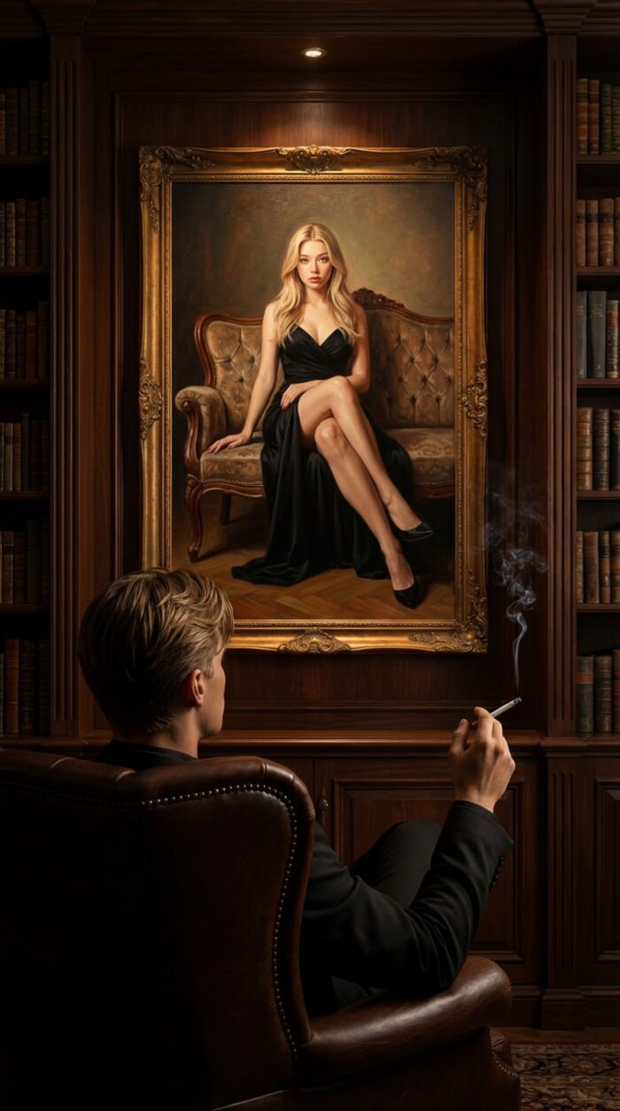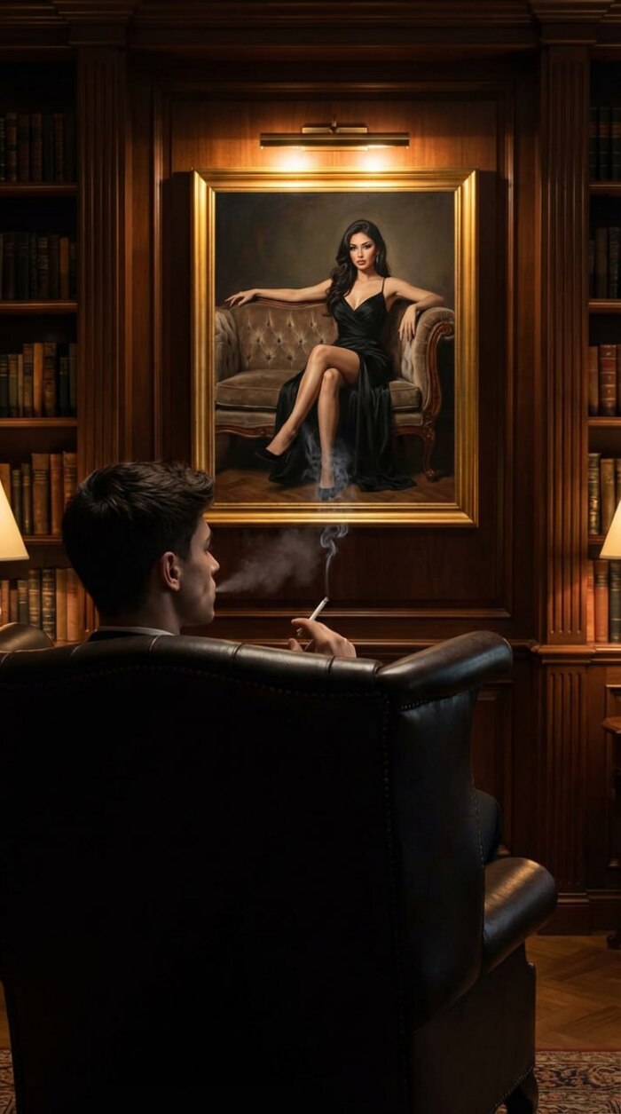 Сцена: тёмная классическая библиотека с деревянными панелями и книжными полками, тёплый приглушённый свет, атмосфера уюта и роскоши. Мужчина сидит в кожаном кресле спиной к камере, слегка в пол-оборот, в уверенной расслабленной позе. В руке сигарета, от неё поднимается тонкий реалистичный дым. Он смотрит вперёд, на большой классический портрет в массивной золотой раме, висящий на стене.
