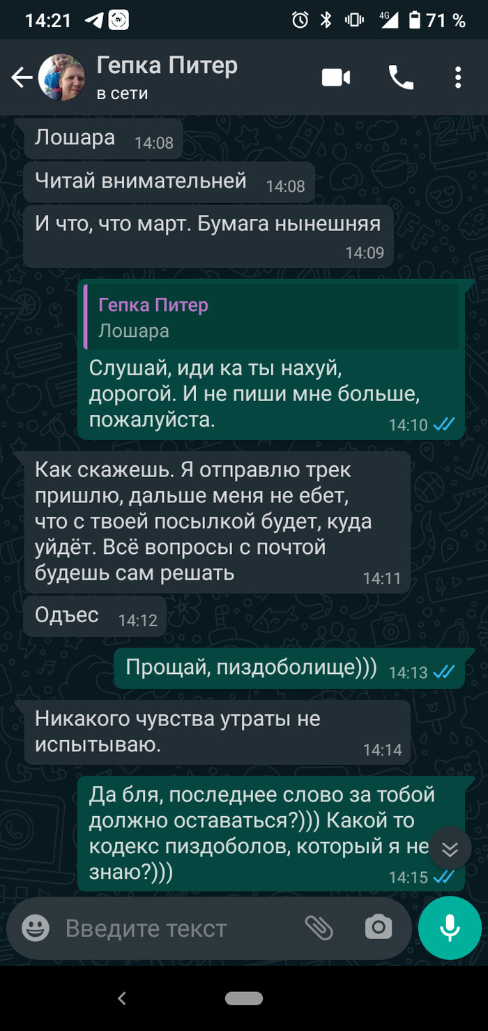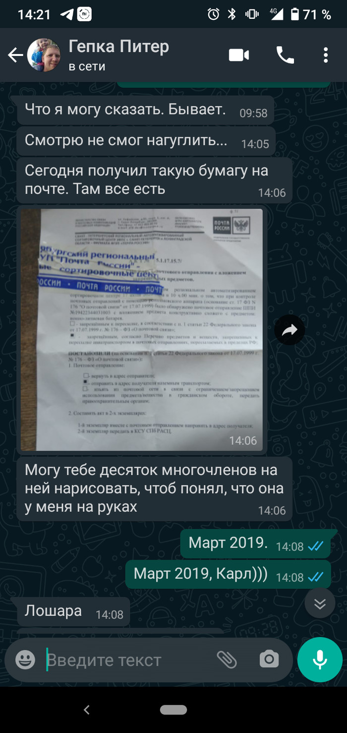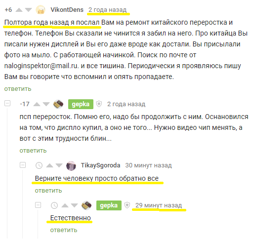 3) Мастер забыл, а ты и не напоминал. - Судьбой девайса интересовался вначале раз в месяц, потом раз в 3 месяца. Под конец общения просили вернуть девайс, после чего человек перестал читать сообщения вообще. Это общение в итоге заняло где-то полтора года, телефон получил спустя 2 года, после постов.