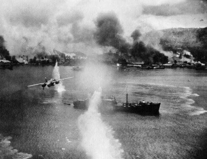 Американский бомбардировщик B-25 Mitchell атакует японское транспортное судно «Хаясаки» в порту Рабаула. Ноябрь 1943