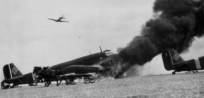 Экипаж немецкого транспортного самолета Junkers Ju 52 пытается спрятаться от атаки штурмовика под хвостом своего самолета.