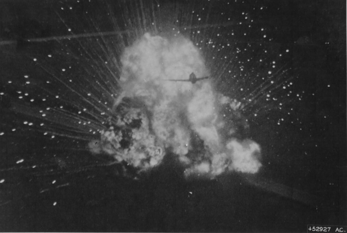 Палубный торпедоносец-камикадзе Nakajima B5N "Kate" прорывается сквозь плотный зенитный заградительный огонь и поражает корабль