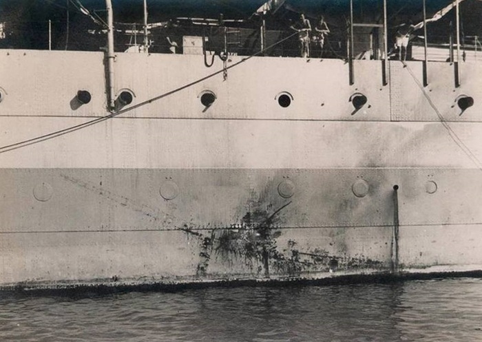 Неудачная попытка тарана тяжёлого крейсера, предположительно, на палубном пикирующем бомбардировщике Aichi D3A