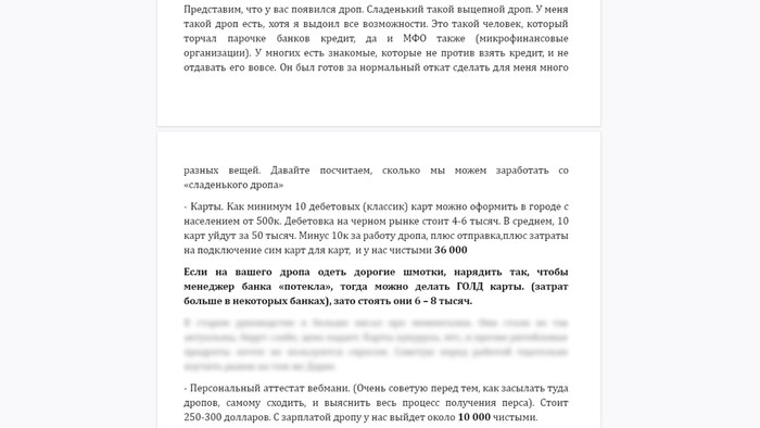 Казалось бы, вся эта информация о дропах известна жуликам благодаря сарафанному радио. Нельзя ж купить книгу о том, как найти подставное лицо, но как оказалось – в интернете есть методичка по дропологии. Часть информации для видео/статьи я достал именно из нее, а другая часть информации просто подтвердилась. Она, то есть эта методичка, продается на различных форумах и стоит достаточно дорого. Называть никнейм автора и, тем более, оставлять каких-то ссылок не буду, чтобы вы таким не занимались. Все-таки там указано как именно становится дроповодами, кого можно заманить и каким образом и так далее. К примеру фрагмент с методички: