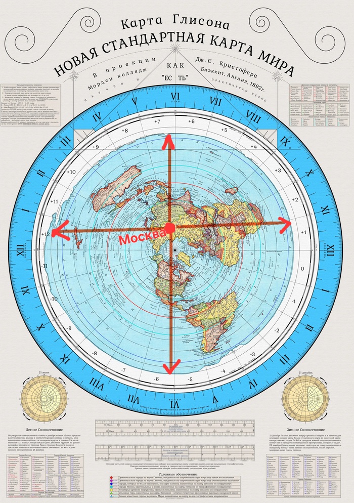 Если четыре группы, начнут своё путешествие от нулевого километра, например Москвы, то каждая из них, не важно в каком направлении по прямой они отправились: север, юг, восток или запад, в какой то момент, любая из групп упрется в ледяную стену антарктиды, а за тем по кругу встретят остальные группы. Так как север, именно на нашей земле, находится в середине, а по краям, южное, ледяное кольцо.