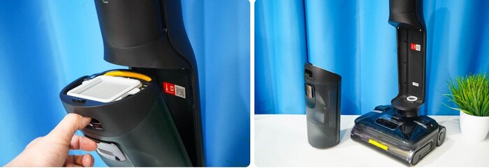 Контейнер для влажных отходов располагается вертикально на корпусе пылесоса. В этот контейнер собирается грязная вода, отжатая с ролика, и мелкий мусор, который пылесос засасывает. Внутри размещается уловитель для крупного мусора/волос, фильтр грубой очистки (решетки + металлическая сетка) и тонкой очистки (Hepa). Фильтры и контейнер можно мыть. Отмечу внутри продуманную систему с дополнительными трубками каналами для отвода воды — это позволяет полностью наклонять пылесос таким образом, что вода из контейнера не попадает в двигатель.