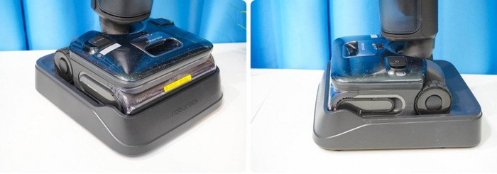 Вот так выглядит пылесос, установленный на базу самоочистки. Для запуска самоочистки нужно немного воды в контейнере и остаток заряда (около 20% и выше). По времени самоочистка занимает пару минут, потом идет сушка ролика.