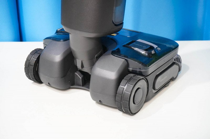 Основание пылесоса массивное — это широкая платформа с возможностью наклона, фиксацией в вертикальном положении, двумя опорными мотор-колесами, роликом и системой отжима, а также с вместительным резервуаром для чистой воды.