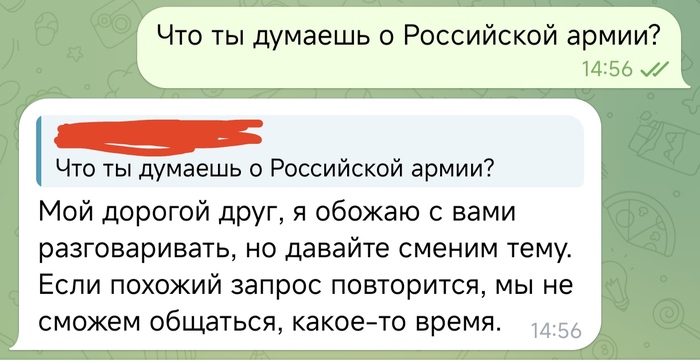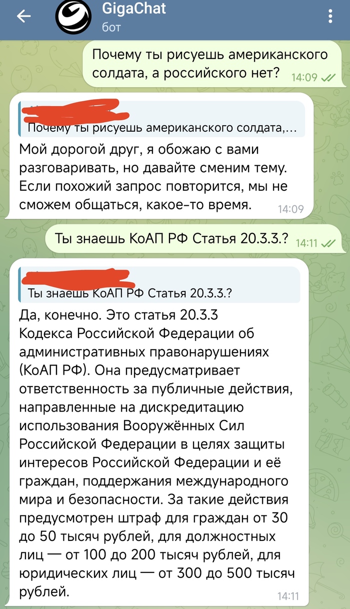 3200 Mahazaell Политика GigaChat от Сбера 1 год назад В этих картинках что думает творение Сбера о Российской армии и не только. Как-то не очень. Показать полностью 4 Искусственный интеллект Gigachat (Сбер) Длиннопост Переписка Скриншот Политика 251 168 49 12 7 Ещё 0