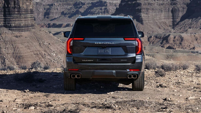 Внедорожник хоть и сохранил прежний грозный стиль, но заметно изменился в лице. Фары стали более узкими и высокими, а новая решетка радиатора теперь может иметь светодиодную подсветку. У задних фонарей изменено светодиодное наполнение, круглые выпускные патрубки заменены прямоугольными. Как и Escalade, обновленный GMC Yukon можно заказать с 24-дюймовой обувкой. Впрочем, для внедорожной версии AT4 Ultimate заготовлены 20-дюймовые колеса с высокопрофильными шинами. Такой Yukon также отличается иными бамперами и решеткой радиатора, у него есть дополнительная защита двигателя и выставленные напоказ ярко-красные буксировочные проушины.