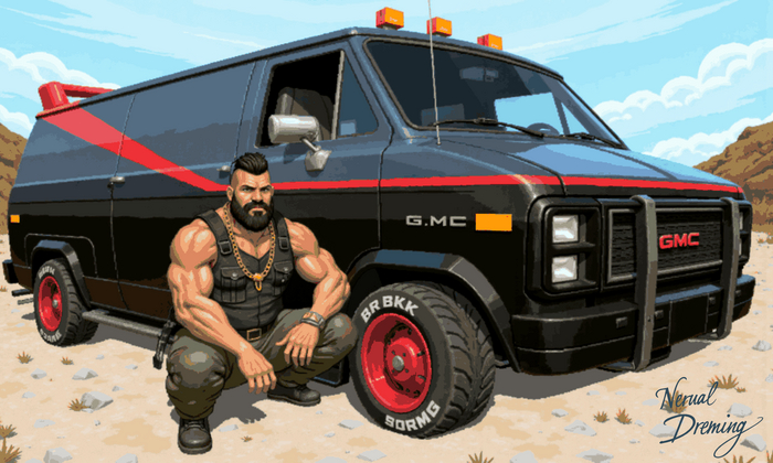 A pixel art scene featuring B.A. Baracus and his iconic GMC van. B.A. is a muscular black man with his signature mohawk hairstyle, thick black beard with neat edges, multiple gold chains around his neck and gold rings on his fingers. He's wearing camouflage cargo pants, a sleeveless black tank top showing his muscular arms, and combat boots. He's posed crouching confidently next to the van with his signature tough-guy expression. The 1983 GMC Vandura van is detailed in matte black with its distinctive modifications: heavy-duty black bull bar with integrated fog lights protecting the front grille, orange marker lights on the roof, roof-mounted spotlights, and a prominent red spoiler. The signature red stripe starts at the front doors and sweeps upward diagonally toward the back, connecting to the red roof spoiler. The van features custom red turbine-style wheels with white lettering on the tires, black GMC grille with square headlights, and boxed fender flares. The van is positioned at a three-quarter angle to show both its aggressive front end and the diagonal red stripe detail. Rendered in 16-bit pixel art style with careful attention to B.A.'s iconic look and the van's custom details. The scene is set in bright daylight to highlight all the details of both the character and vehicle. <lora:Pixel_Art_-_Style:1> pixelart Steps: 20, Sampler: Euler, Schedule type: Simple, CFG scale: 1, Distilled CFG Scale: 3.5, Seed: 3474409318, Size: 1280x768, Model hash: c39bd12b58, Model: artsyFlux_v1FP8, Denoising strength: 0.73, img2img Hires Fix: "{'scale': 1.5, 'upscaler': '4x_NMKD-UltraYandere_300k', 'denoise': 0.33}", Lora hashes: "Pixel_Art_-_Style: 0d9104ec3e6d", Version: f2.0.1v1.10.1-previous-632-g2051c410, Module 1: ae, Module 2: t5xxl_fp8_e4m3fn, Module 3: clip_l, Source Identifier: Stable Diffusion web UI