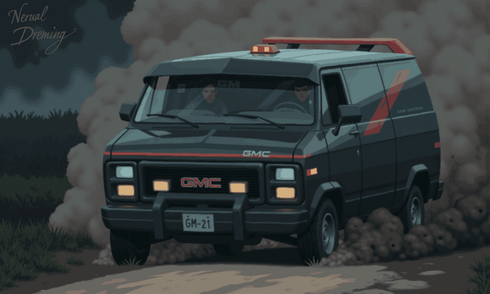 A pixel art scene with text title 'The A-Team' in bold military stencil font with chrome effect. The iconic black 1983 GMC Vandura van with comprehensive front-end customization: large black bull bar with integrated fog lights below the headlights, roof-mounted spotlights/light bar, and a prominent red roof spoiler. The van's signature red striping pattern starts at the side doors, sweeping upward diagonally toward the back, connecting to the red spoiler. Custom red turbine-style wheels and a black grille with GMC letters. The front has characteristic square headlights, additional driving lights on the roof, and orange marker lights. The robust bull bar/brush guard protects the entire front end, wrapping around the headlights and grille. The van is shown at a dramatic three-quarter angle, emphasizing its aggressive stance with the protective front end modifications and the diagonal flow of the red stripe. The black bodywork has a metallic shine with careful pixel dithering for highlights, featuring the signature boxed fender flares and wide stance. <lora:Pixel_Art_-_Style:1> pixelart Steps: 20, Sampler: Euler, Schedule type: Simple, CFG scale: 1, Distilled CFG Scale: 3.5, Seed: 2300152840, Size: 1280x768, Model hash: c39bd12b58, Model: artsyFlux_v1FP8, Denoising strength: 0.73, img2img Hires Fix: "{'scale': 1.5, 'upscaler': '4x_NMKD-UltraYandere_300k', 'denoise': 0.33}", Lora hashes: "Pixel_Art_-_Style: 0d9104ec3e6d", Version: f2.0.1v1.10.1-previous-632-g2051c410, Module 1: ae, Module 2: t5xxl_fp8_e4m3fn, Module 3: clip_l, Source Identifier: Stable Diffusion web UI