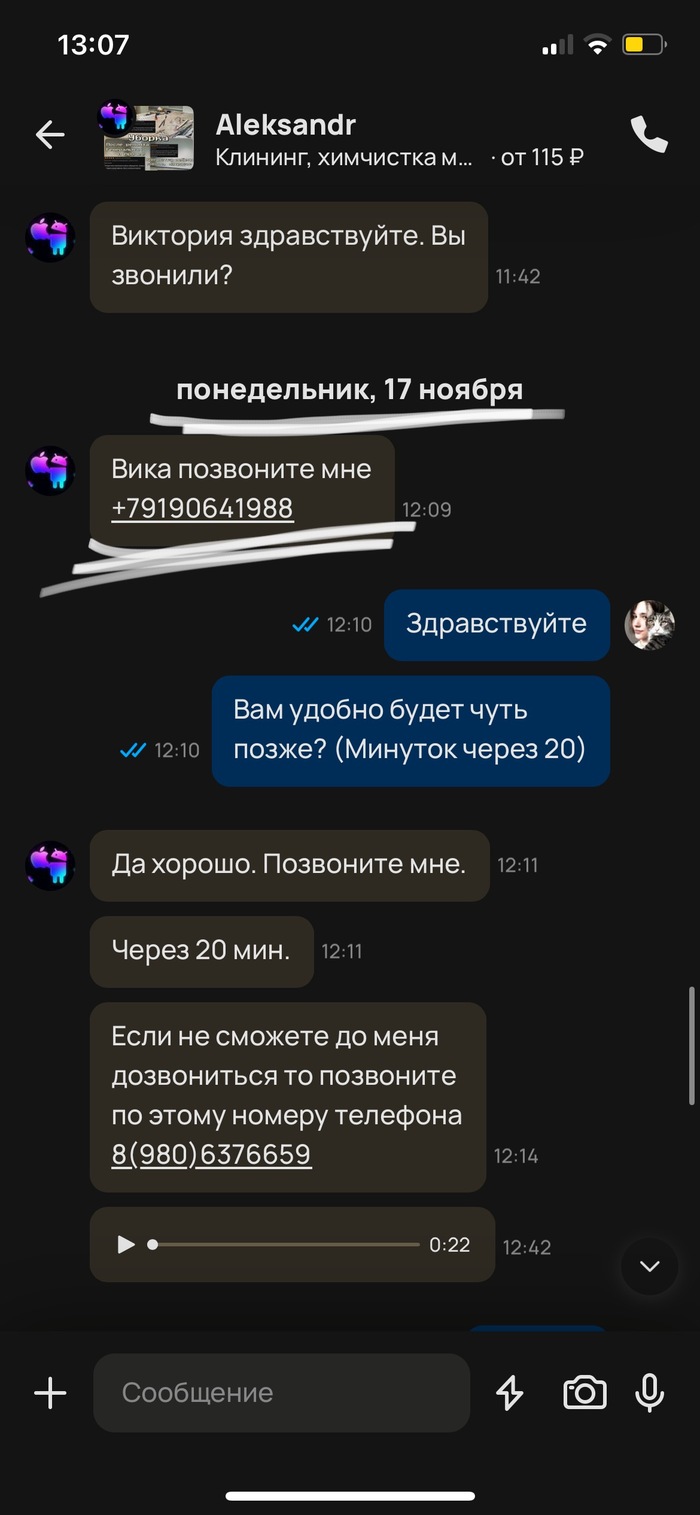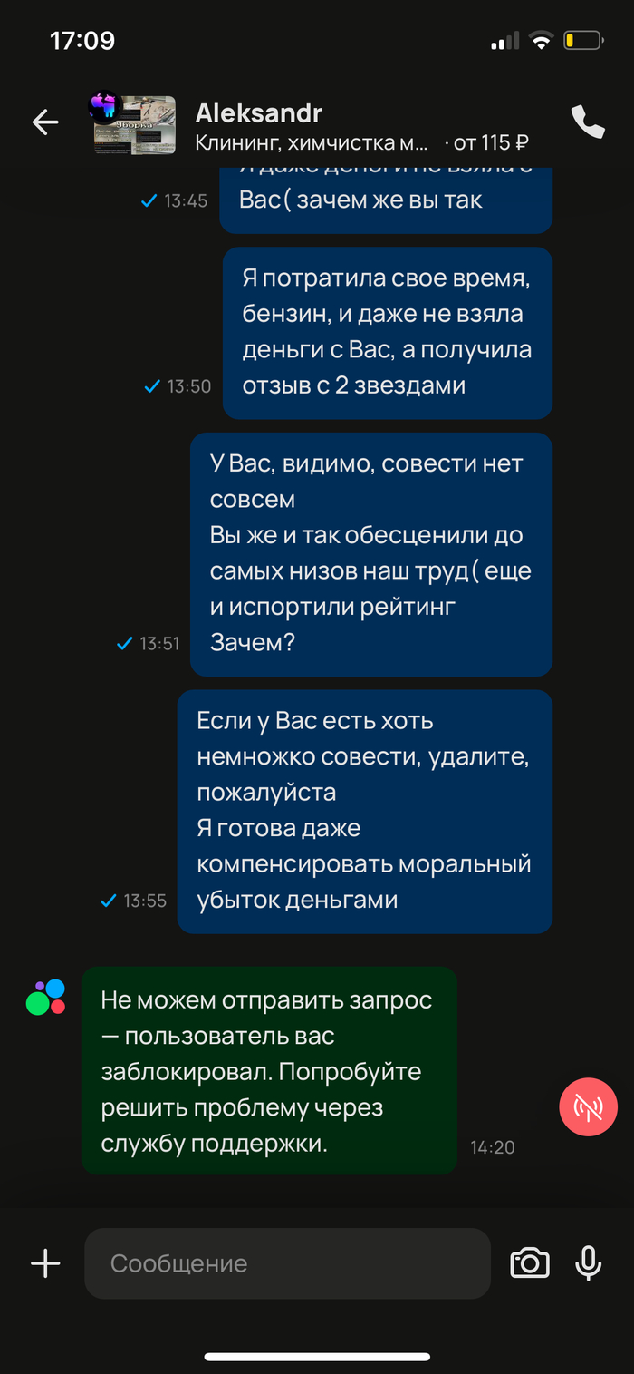 Я начала им названивать, написывать везде; я готова была даже компенсировать деньгами моральный убыток (АХАХА, моральный убыток?? Кому он еще нанесен - я потратила бензин, приехала, возилась в чужой грязи, все отмывала, и это за бесплатно + получила хреновый отзыв) - им плевать, они кинули везде в ЧС. Если бы людей действительно не устроило что-то, они бы решали, а не просто слились. И так понятно, что «обиженки» просто не получили за дюшман то, что хотели;